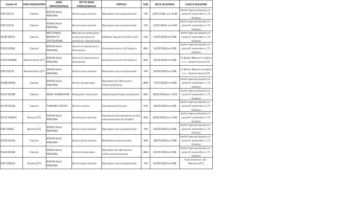 L’ente di formazione Archè Impresa Sociale S.r.l.  procederà alla selezione degli allievi secondo le modalità indicate nella sezione “Modalità di selezione” presente nella scheda indicata sul portale https://catalogo.siciliafse1420.it/portale, per i seguenti percorsi formativi e nelle date indicate:
