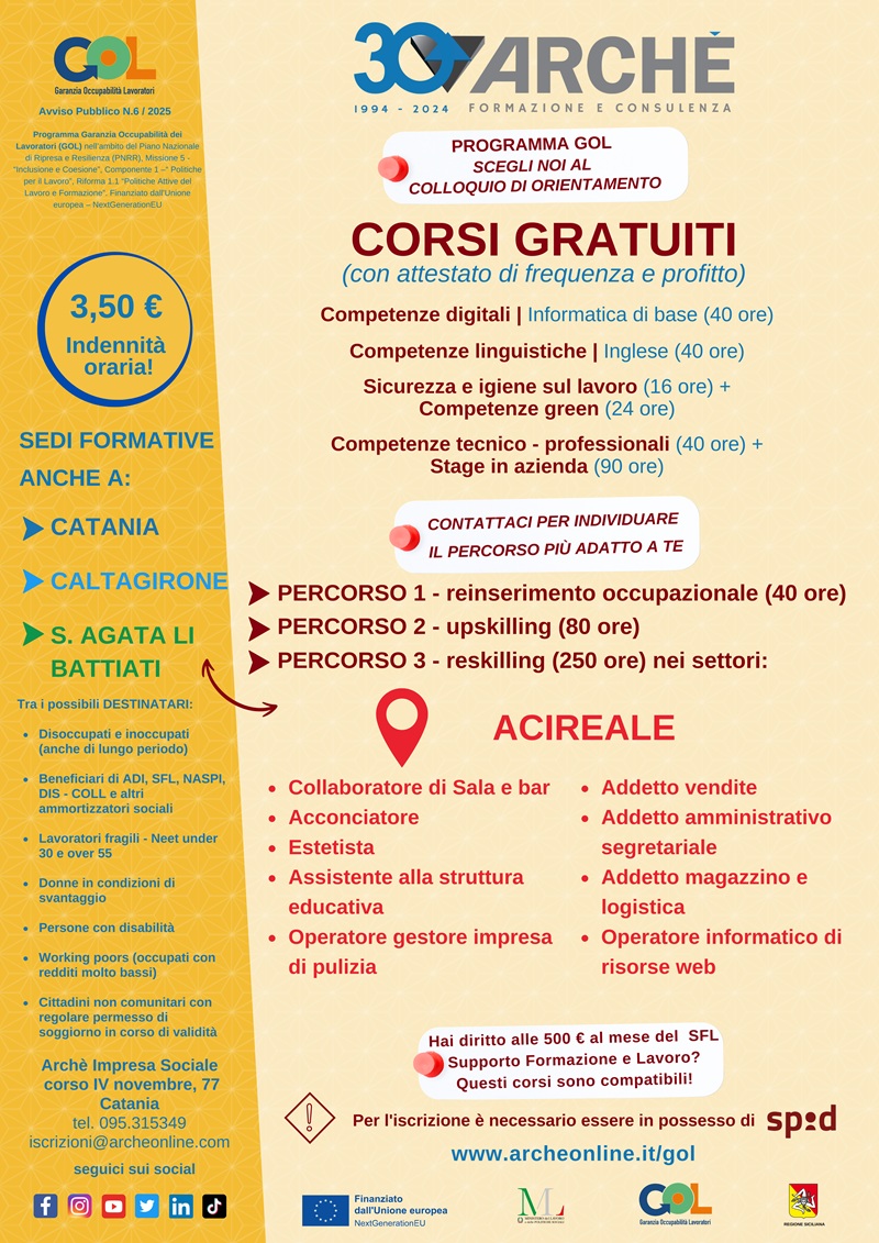 Archè, ente di formazione e agenzia per il lavoro che da quasi trent’anni opera in Sicilia, offre ai siciliani l'opportunità di partecipare al progetto GOL che ridisegna i servizi per il lavoro per migliorare l'inserimento lavorativo delle persone. Servizi pubblici e privati sono più vicini ai cittadini, per offrire percorsi personalizzati di ingresso o reingresso al lavoro.