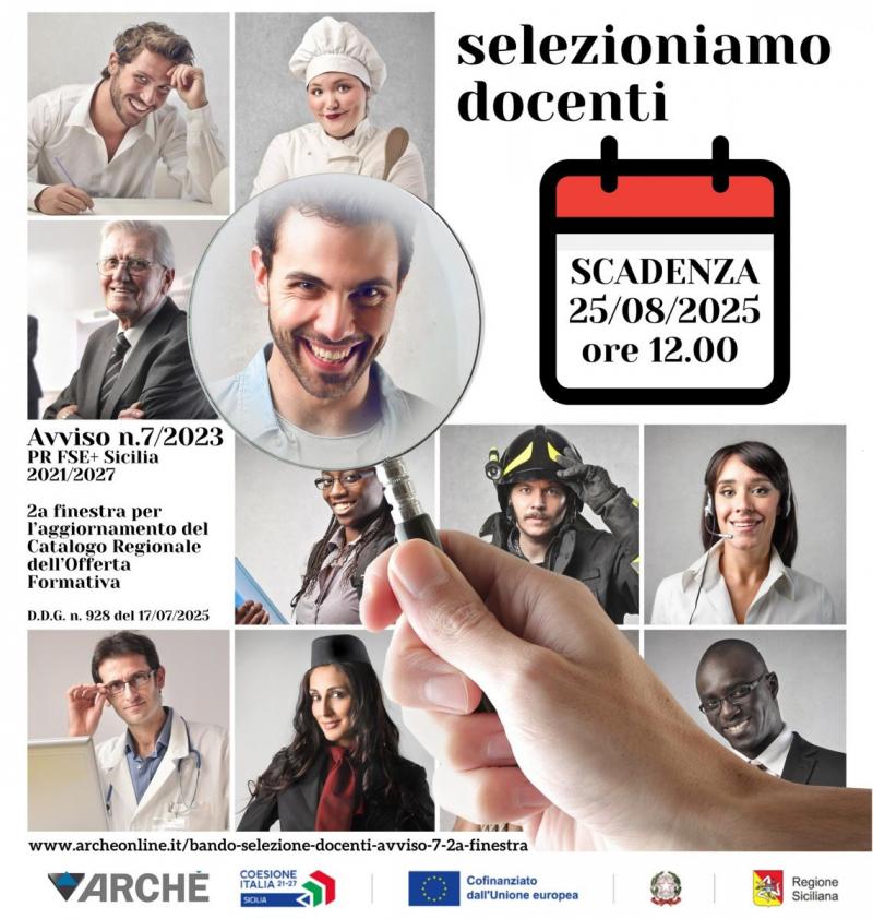 BANDO DI SELEZIONE PER IL RECLUTAMENTO DEL PERSONALE DA IMPEGNARE nell'Avviso Pubblico n. 7/2023 PR FSE Sicilia 202172027 - 2 Finestra (Biennio 2025-2026) per l'aggiornamento del Catalogo regionale dell’offerta formativa e per la correlata realizzazione di percorsi formativi di qualificazione mirati al rafforzamento dell’occupabilità in Sicilia - D.D.G. n. 928 del 17/07/2025