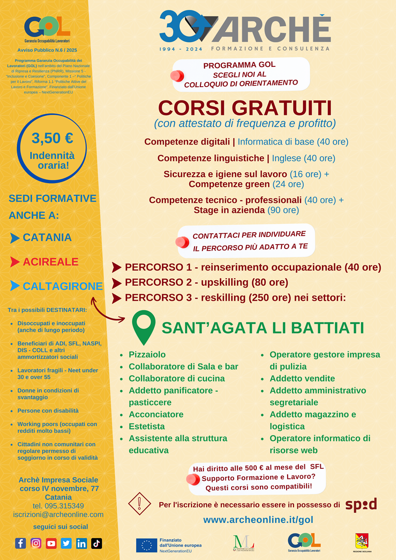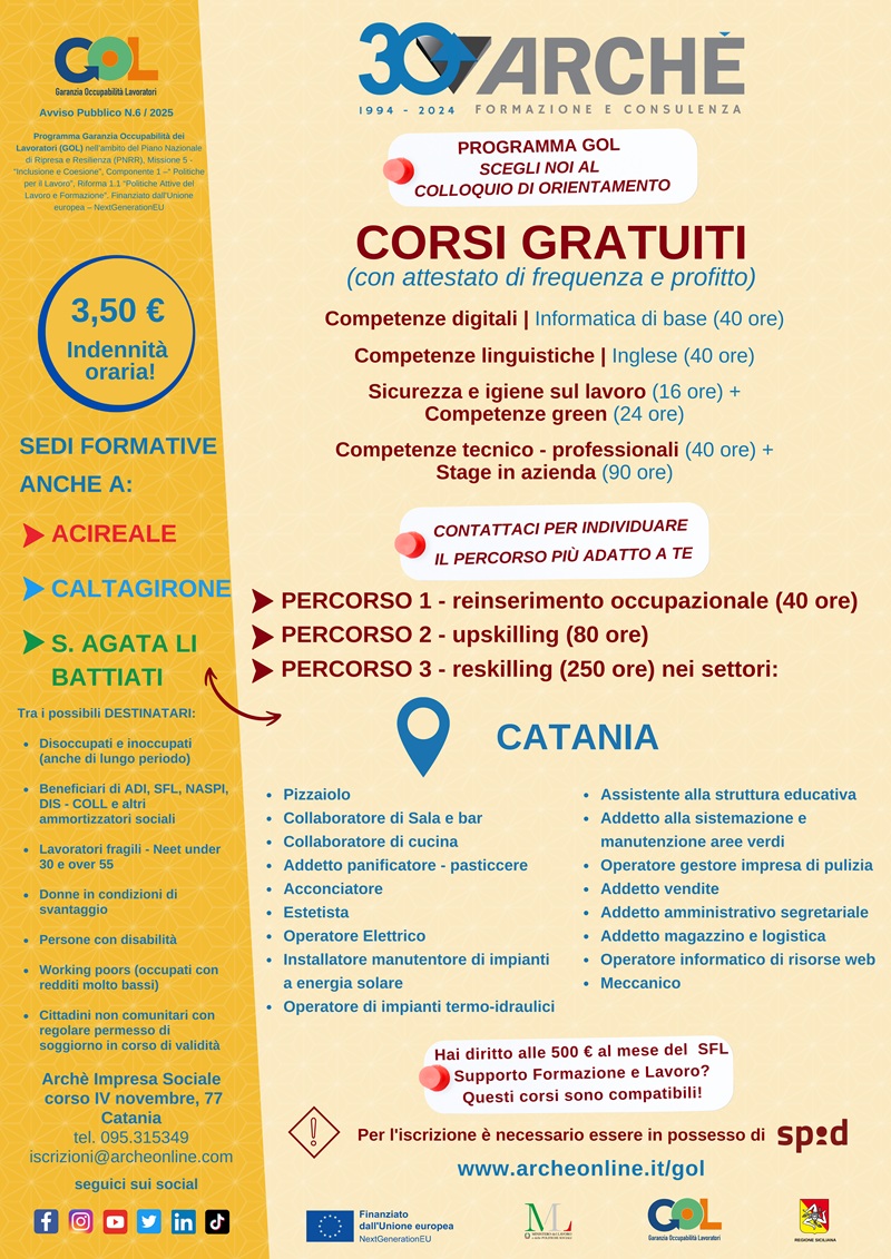 Archè, ente di formazione e agenzia per il lavoro che da quasi trent’anni opera in Sicilia, offre ai siciliani l'opportunità di partecipare al progetto GOL che ridisegna i servizi per il lavoro per migliorare l'inserimento lavorativo delle persone. Servizi pubblici e privati sono più vicini ai cittadini, per offrire percorsi personalizzati di ingresso o reingresso al lavoro.
